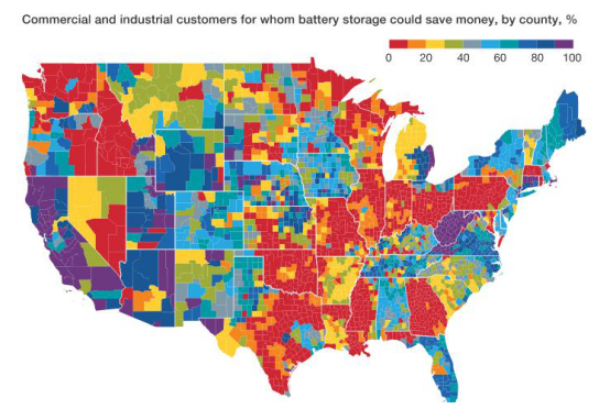 在此基礎(chǔ)上,美國(guó)分布式電池安裝市場(chǎng)迅速擴(kuò)張,每年增長(zhǎng)速度高達(dá)50%。迄今為止,此類安裝主要用于管理“電力需求費(fèi)用”,基于電力高峰需求的月度支付。由于全年的支付與幾天內(nèi)幾小時(shí)內(nèi)最高能源消耗有關(guān),因此通過平滑電力需求以降低成本具有強(qiáng)烈的經(jīng)濟(jì)動(dòng)機(jī)。