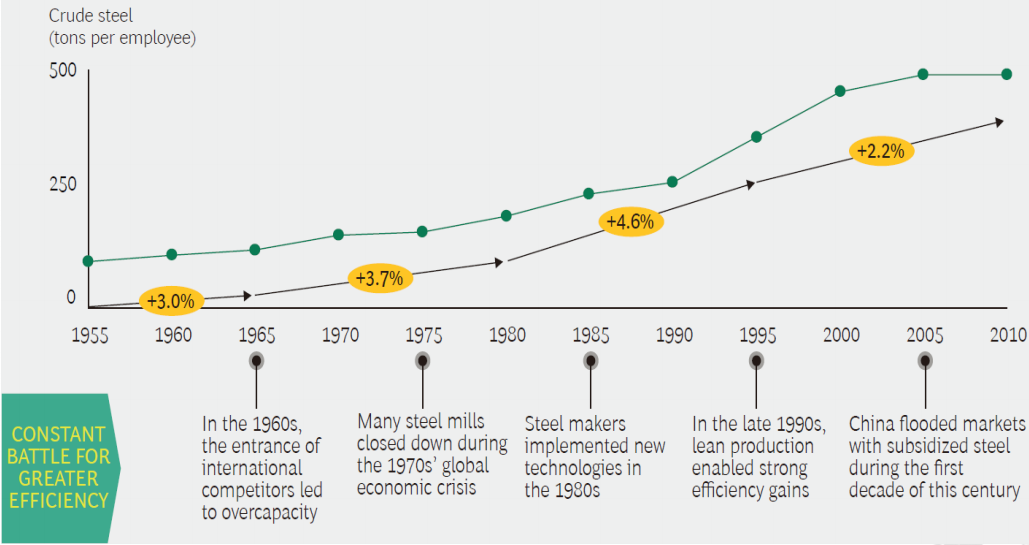 有人可能會說,一般制造業(yè)不能作為電力行業(yè)的典型參考案例,因為它的資本密集程度要低得多。但兩大資本密集型行業(yè)(化工和鋼鐵)的經驗也證實了一種觀點,即發(fā)電企業(yè)可以通過一系列的能效提升手段,使生產率顯著增長。在過去的 15 年中,歐洲化學工業(yè)的勞動生產率以每年超過 2%的速度增長。到 2000 年,化工行業(yè)通過專注于核心業(yè)務,剝離外圍業(yè)務,實現(xiàn)了高度整合。在接下來的 10 年,面對中國的競爭和全球經濟低迷,化工企業(yè)認識到,必須更深刻的思考如何提高經營效率。全廠優(yōu)化、專業(yè)化和過程自動化都是驅動行業(yè)生產率增長的有效手段。在德國,鋼鐵行業(yè)在過去半個世紀里提高了大約三倍的生產率,經受住了幾次危機的考驗。鋼鐵制造商通過采用新技術和精益生產系統(tǒng)來促進持續(xù)改進,從而適應成本的快速削減。