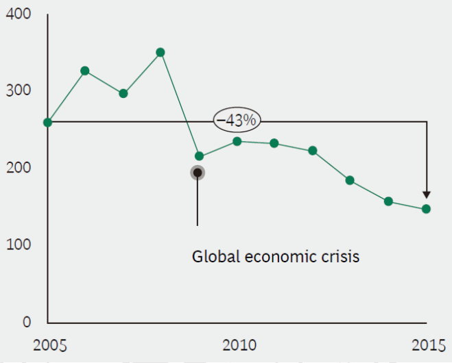受行業(yè)重大變革影響,歐洲的傳統(tǒng)發(fā)電企業(yè)一直如履薄冰。在過去 10 年間,受產能過剩導致的利用小時數(shù)和上網電價大幅下降影響,發(fā)電企業(yè)承受著巨大的市場競爭壓力。自 2005 年以來,歐洲十大發(fā)電企業(yè),自 2005 年以來,歐洲十大發(fā)電企業(yè)由化石燃料、核電或水力發(fā)電所構成的裝機中,設備利用水平下降了 14%,每兆瓦裝機容量的年營收實際降幅已經超過了 40%,同時,發(fā)電企業(yè)的股價表現(xiàn)不佳,信用評級也在下跌。許多其他地區(qū)的生產商也正面臨相似的挑戰(zhàn)。