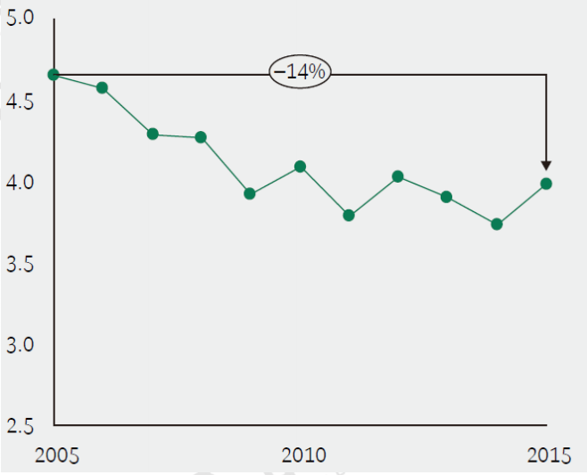 圖 1. 十年期間歐洲前十大發(fā)電企業(yè)設備利用水平下降了 14%(單位:TWh/GW)