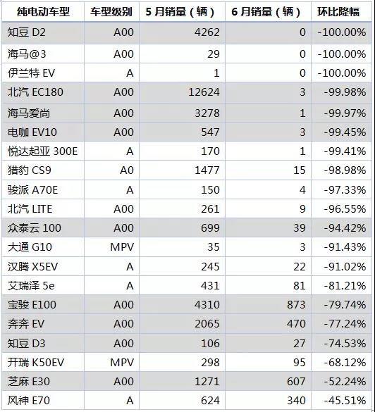 分析6月銷量環(huán)比跌幅,不少明星級A00級車型的銷量可謂斷崖式下跌至個位數(shù)甚至0,新政的市場影響可謂立竿見影。北汽EC180和知豆D2,這兩款車在2018年5月以前基本一致盤踞在新能源乘用車銷量榜TOP的首要位置,北汽EC180拿了多少個月的銷冠已無需去盤點,但是6月份基本從市場上銷匿。