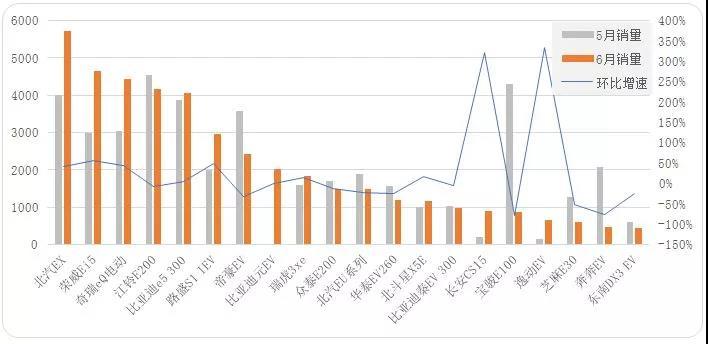 純電動乘用車近兩月銷量及增幅(按6月銷量排序單位:輛)
