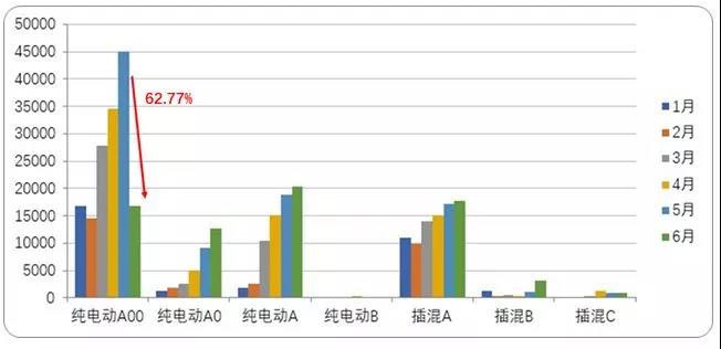 6月12日開始,新的補貼政策開始實施,市場在5月之前和6月的表現(xiàn),則是對這一政策的反饋。最新的補貼政策,總體鼓勵高續(xù)駛里程、高能量密度、低能耗車型,相應(yīng)地,基于實際補貼的乘數(shù)效應(yīng),之前純電動乘用車市場的主力支撐A00級車型在上半年快速消納補貼“最后的盛宴”之后,6月銷量應(yīng)聲滑落。