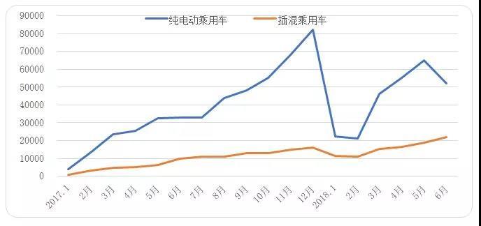 2017年1月-2018年6月新能源乘用車銷量走勢