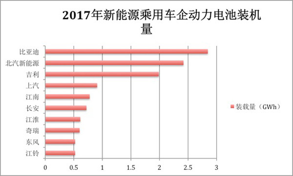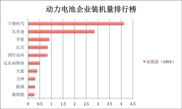 與新能源乘用車銷量相對應(yīng)的,比亞迪、北汽新能源與吉利以2.85GWh、2.42GWh和1.99GWh位列動力電池裝機量前三。
