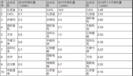 表1 2016-2018年我國動力電池裝機量TOP10企業(yè)