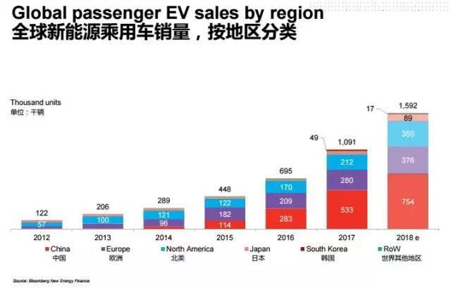 據彭博新能源財經數據表示,全球新能源汽車銷量從2012年的12.2萬輛猛增至2018年的159.2萬輛。全球新能源汽車年銷量將從2017年的100萬輛增至2040年的6000萬輛,年復合增長率將達到19%。