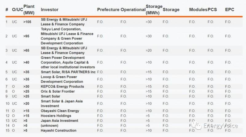 下面的列表展示了2018年初開始運(yùn)營(yíng)(O)或正在建設(shè)(UC)的15個(gè)集中式光伏+儲(chǔ)能項(xiàng)目。目前日本前6大已運(yùn)營(yíng)的光伏+儲(chǔ)能項(xiàng)目的累計(jì)產(chǎn)能為44.3MW,預(yù)估的累計(jì)產(chǎn)能約為120MW。