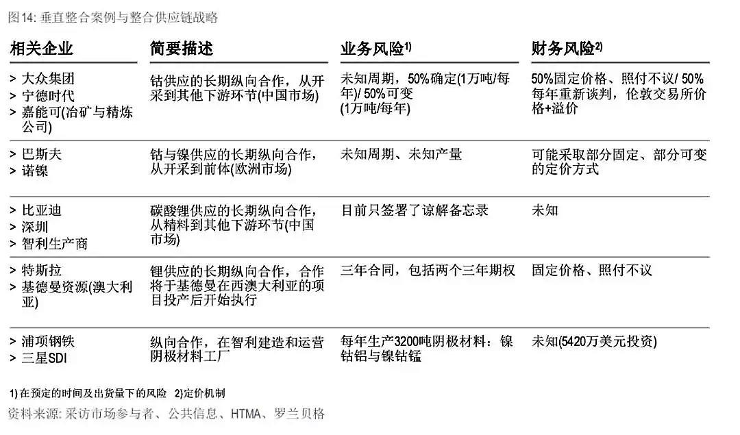 例如大眾集團(tuán)、寧德時(shí)代便與嘉能可(冶礦與精煉公司)展開鈷供應(yīng)的長期縱向合作。價(jià)格采用50%確定(1萬噸/年)/50%可變(每年重新談判,倫敦交易所價(jià)格+溢價(jià))進(jìn)行。