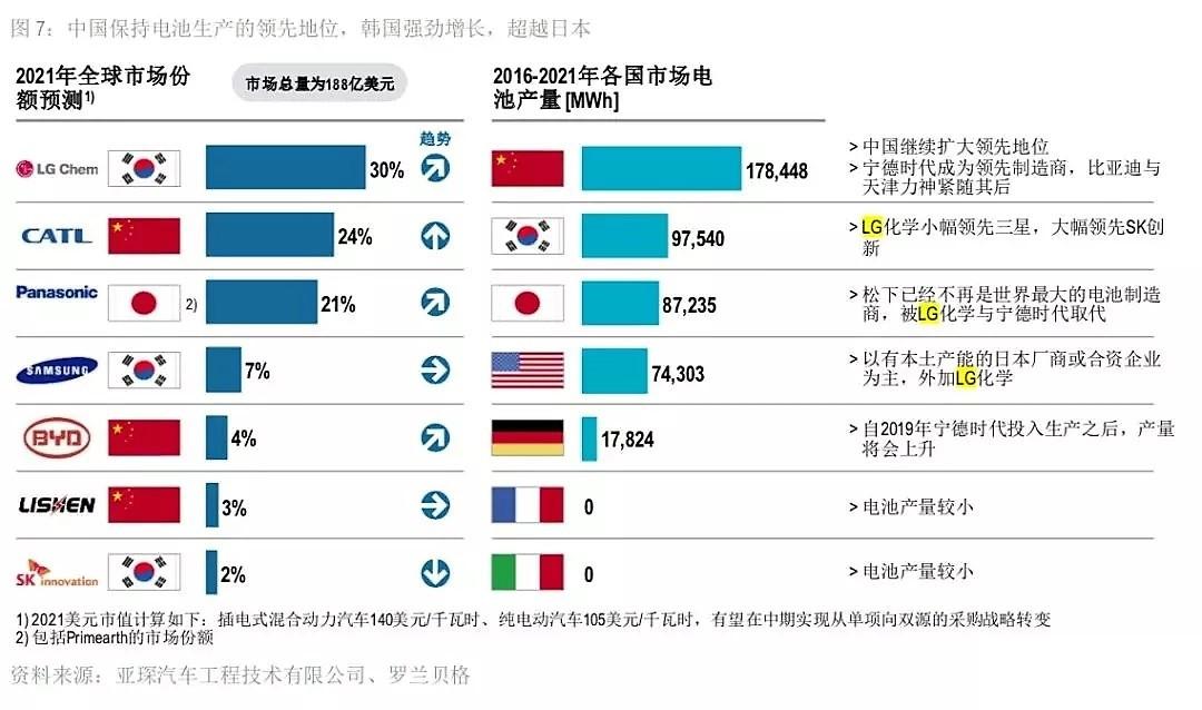 至2021年,中國、韓國、日本、美國、德國將位列全球電池產(chǎn)量前五,而電池市場總量將達(dá)188億美元(插混汽車140美元/千瓦時(shí)、春點(diǎn)汽車105美元/千瓦時(shí)),在全球市場份額中,LG將占比30%;寧德時(shí)代占比24%、松下占比21%、三星占比7%、比亞迪占比4%。