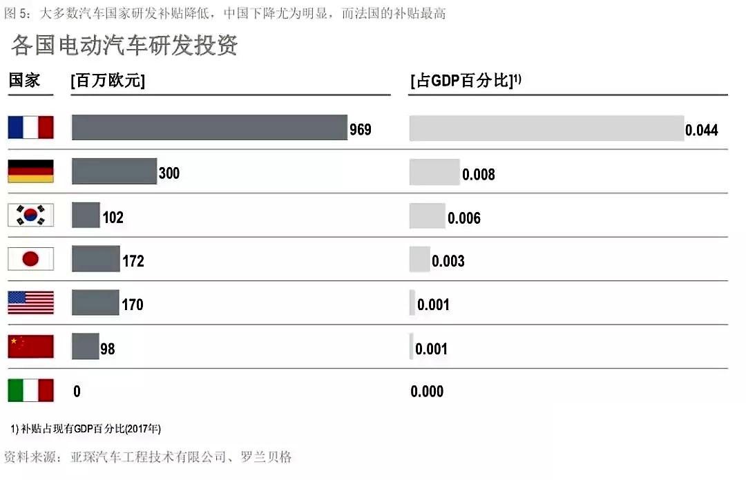 羅蘭貝格的《2018全球電動(dòng)汽車發(fā)展指數(shù)》(以下簡稱指數(shù))也顯示,從政府層面“對電動(dòng)汽車研發(fā)的支持正在減少,部分國家經(jīng)費(fèi)持續(xù)降低。政府研發(fā)項(xiàng)目已經(jīng)接近尾聲,目前也沒有新的項(xiàng)目上馬;即使有,規(guī)模也非常有限?!逼渲校ツ曛袊陔妱?dòng)汽車研發(fā)投資9800萬歐元,占比GDP0.1%。相比而言,法國的投入則占比GDP4.4%。