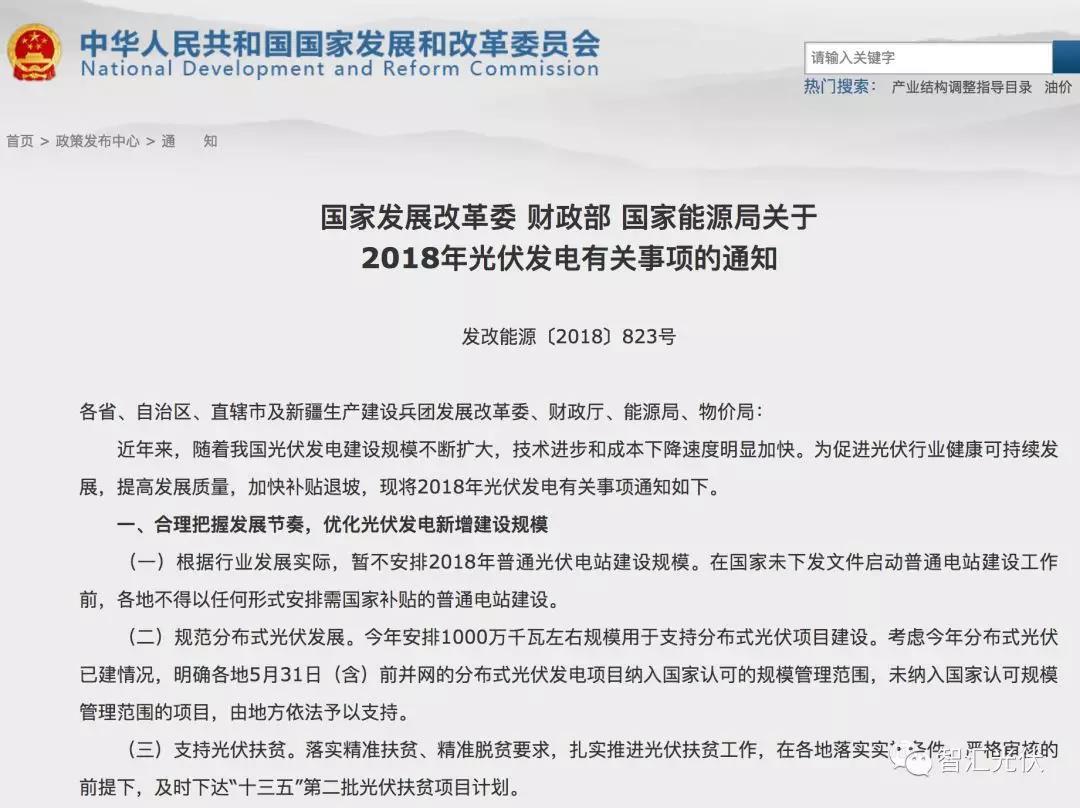 2018年5月31日,三部委聯(lián)合下發(fā)《關(guān)于2018年光伏發(fā)電有關(guān)事項的通知(發(fā)改能源〔2018〕823號)》文件,將6月1日及以后并網(wǎng)的三類電價區(qū)的標(biāo)桿電價直接降至0.5元/kWh、0.6元/kWh、0.7元/kWh。