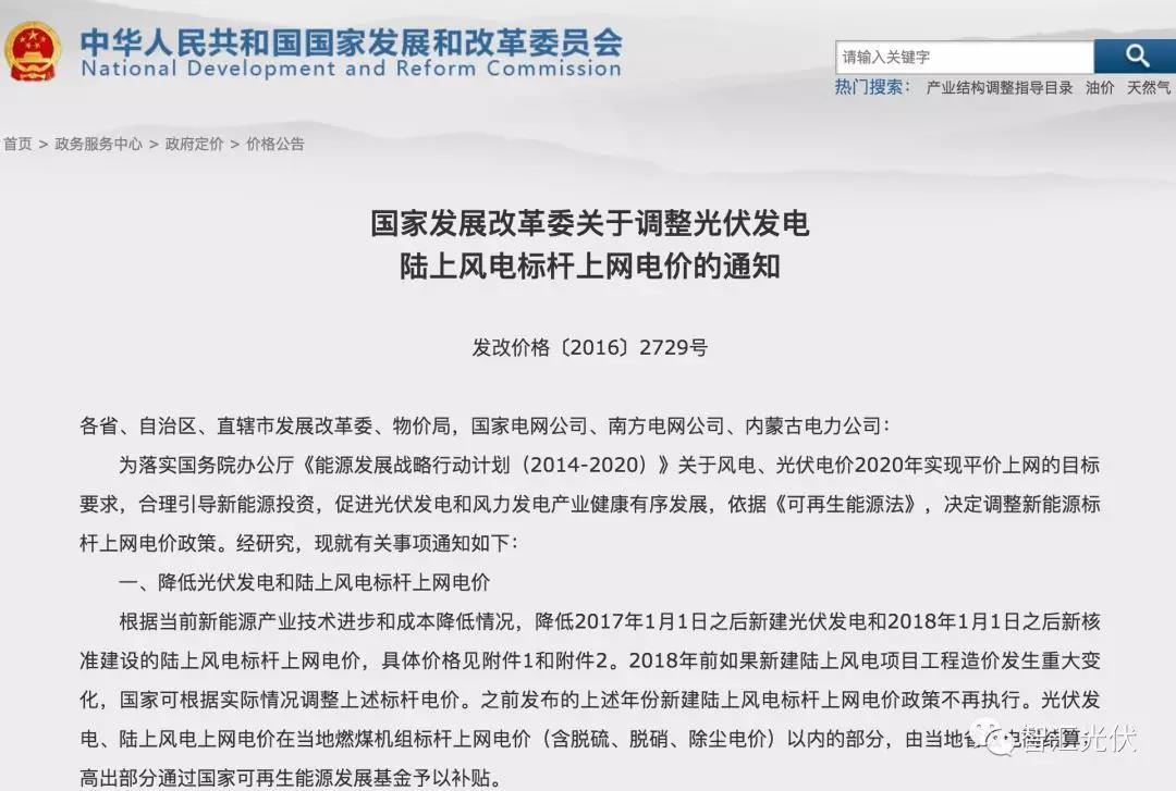 2016年12月26日,國家發(fā)展改革委下發(fā)《關(guān)于調(diào)整光伏發(fā)電陸上風(fēng)電標(biāo)桿上網(wǎng)電價的通知(發(fā)改價格〔2016〕2729號)》,提出: