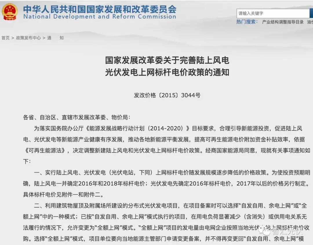 2015年12月22日,國家發(fā)展改革委下發(fā)《關(guān)于完善陸上風(fēng)電光伏發(fā)電上網(wǎng)標(biāo)桿電價政策的通知(發(fā)改價格〔2015〕3044號)》,提出: