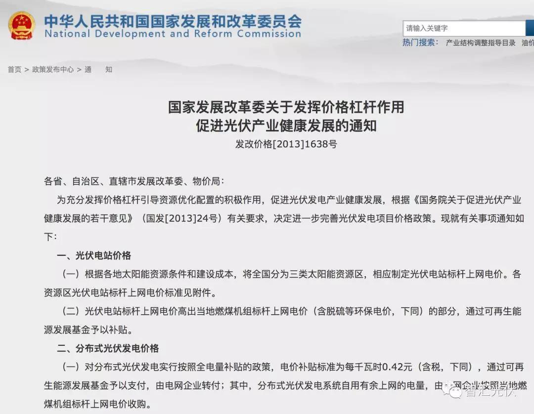 2013年8月26日,國家發(fā)展改革委下發(fā)《關(guān)于發(fā)揮價格杠桿作用促進光伏產(chǎn)業(yè)健康發(fā)展的通知(發(fā)改價格[2013]1638號)》提出: