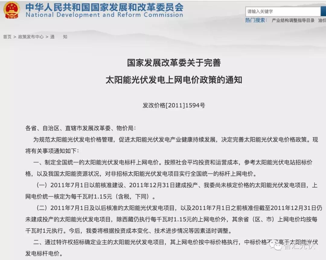 2011年,出臺了我國第一個地面光伏電站的標(biāo)桿電價政策, 7月1日前備案、12月31日之前并網(wǎng)項目,上網(wǎng)為 1.15元/kWh;之后的項目為1元/kWh;分布式光伏繼續(xù)執(zhí)行初始投資補貼。