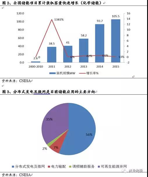 圖2顯示了近年來(lái)我國(guó)儲(chǔ)能項(xiàng)目累計(jì)裝機(jī)規(guī)模變化情況圖??梢钥吹?,從2011年起我國(guó)儲(chǔ)能項(xiàng)目就進(jìn)入快速發(fā)展的階段。2011年全國(guó)儲(chǔ)能項(xiàng)目累計(jì)裝機(jī)規(guī)模僅為38.5MW,2014年末就發(fā)展到了93.7MW,2015年末累計(jì)裝機(jī)規(guī)模達(dá)到了105.5MW。另外,從儲(chǔ)能項(xiàng)目的應(yīng)用分布方面來(lái)看,可以發(fā)現(xiàn),儲(chǔ)能項(xiàng)目在分布式發(fā)電及微網(wǎng)中的應(yīng)用占比高達(dá)56%,超過(guò)了全國(guó)儲(chǔ)能項(xiàng)目的一半以上,可再生能源并網(wǎng)應(yīng)用占比為35%,位居第二。從整體來(lái)看,儲(chǔ)能項(xiàng)目應(yīng)用占比較高的仍為用戶側(cè)。