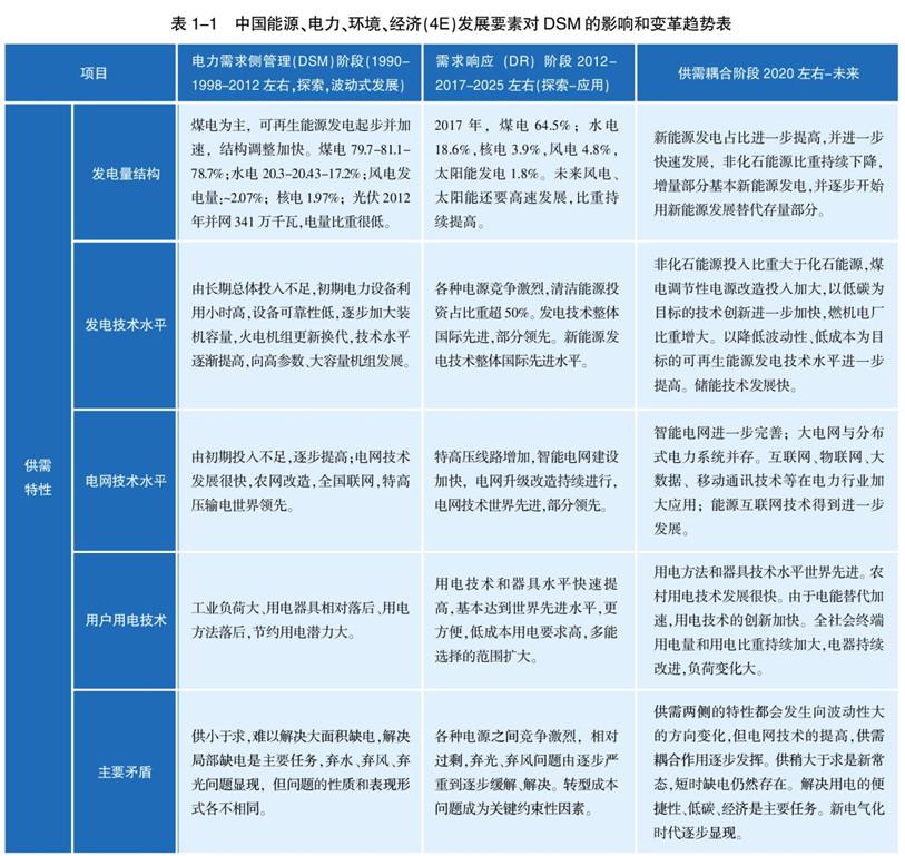 表1-1 是能源、電力、環(huán)境、經(jīng)濟(jì)(4E)發(fā)展要素與DSM的影響和變革趨勢(shì)表。從表中不難看出,DSM、DR以及供需耦合,都是以解決電力供需問(wèn)題為導(dǎo)向的,因此,任何管理手段都必須隨著問(wèn)題的發(fā)展和解決問(wèn)題的需求與時(shí)俱進(jìn)。DSM每個(gè)階段的時(shí)間長(zhǎng)短并不相同,變革并不因?yàn)闀r(shí)間長(zhǎng)短而變,而供需特性和低碳(結(jié)構(gòu))特性變化才是關(guān)鍵點(diǎn),即電力短缺與富余度以及新能源所占的發(fā)電比重大小決定了不同階段到來(lái)的時(shí)間點(diǎn)。從電力需求管理手段的內(nèi)涵上看,三個(gè)階段在時(shí)間的連接處和對(duì)應(yīng)的措施上是會(huì)有重疊的,且后一階段的措施是對(duì)前一階段的繼承、完善、發(fā)展而不是割裂。面向未來(lái),一般意義上的電力需求管理將會(huì)一直延續(xù)至電力的長(zhǎng)遠(yuǎn)發(fā)展,但作為傳統(tǒng)或特定意義上的“DSM”的作用將隨著電力供需矛盾轉(zhuǎn)化、能源電力清潔低碳轉(zhuǎn)型發(fā)展、電力技術(shù)和用電技術(shù)的進(jìn)步等而逐步淡化,并終將成為歷史。