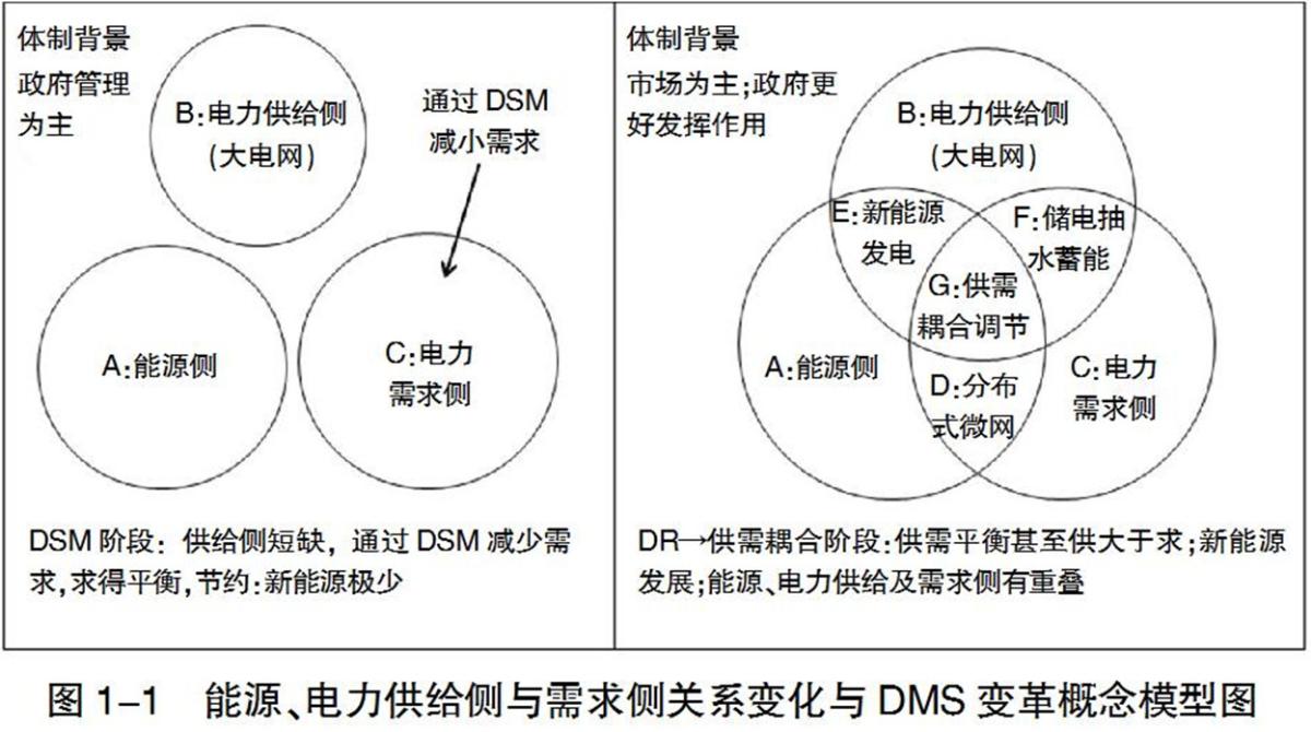 圖1-1是說(shuō)明能源側(cè)、電力供給側(cè)、電力需求側(cè)的關(guān)系變化與DMS變革的概念模型圖。圖中“A:能源側(cè)”“B:電力供給側(cè)”“C:電力需求側(cè)”等3個(gè)圓形圖案。雖然電力的供與需在物理上共同組成一個(gè)系統(tǒng),且電能的發(fā)、輸、配、供、用在電網(wǎng)內(nèi)是瞬間平衡的,但各環(huán)節(jié)的概念是清晰的。圓圈圖之外可以看成是體制機(jī)制部分,圖的左側(cè)示意DSM階段主要是發(fā)揮政府行政管理的作用,而圖的右側(cè)示意DSM向DR及供需耦合階段的變革主要是發(fā)揮市場(chǎng)機(jī)制的作用,但政府也應(yīng)更好發(fā)揮作用。在圖的左側(cè)部分可以看出,DSM第一階段是在供給短缺、政府管理背景下,A、B、C三個(gè)不相交的圓(或者相交極少)所代表的方面,各方按上下游關(guān)系和各自規(guī)律運(yùn)轉(zhuǎn)。在這一階段,DSM主要通過(guò)減少電力需求側(cè)的需求(節(jié)約),解決供給側(cè)的缺口或者滿(mǎn)足調(diào)峰需求,達(dá)到電網(wǎng)及電力系統(tǒng)安全前提下,技術(shù)層面上的供需平衡。顯然,此階段的DSM顯然不是為了解決能源電力低碳轉(zhuǎn)型問(wèn)題。在圖的右半部分可以看出,在供需平衡或富余、市場(chǎng)手段為主政府發(fā)揮更好作用背景下, A、B、C三個(gè)圓相交了,相交后形成了4個(gè)新區(qū),即D:分布式微網(wǎng)區(qū);E:新能源發(fā)電區(qū);F:儲(chǔ)電包括抽水蓄能區(qū);G:供需耦合區(qū)。當(dāng)然,A、B、C三個(gè)圓并不是同時(shí)相交的,相交的面積重合度也不同。三圓相交時(shí)間和重合度大小,決定了SM向DR方向變革的快慢和程度,這也是各國(guó)的DR并不是同一個(gè)模式的原因。在圖上雖然沒(méi)有顯示出來(lái),但A、C兩個(gè)大圓所包括的所有內(nèi)容都是智能電網(wǎng)覆蓋區(qū),圓與圓相重合的部分是智能電網(wǎng)能夠發(fā)揮最大作用的部分;G部分是電力供需耦合發(fā)揮作用的部分。而A、B、C三個(gè)大圓則是能源互聯(lián)網(wǎng)覆蓋區(qū),也說(shuō)明了,能源互聯(lián)網(wǎng)的基礎(chǔ)和核心是智能電網(wǎng)。我們由前述的未來(lái)發(fā)展的趨勢(shì)可知,3大圓相交的部分會(huì)越來(lái)越大,所以DR發(fā)揮作用的范圍也越來(lái)越大,當(dāng)3圓相交到很大程度時(shí),電力供需耦合將發(fā)揮主導(dǎo)作用。