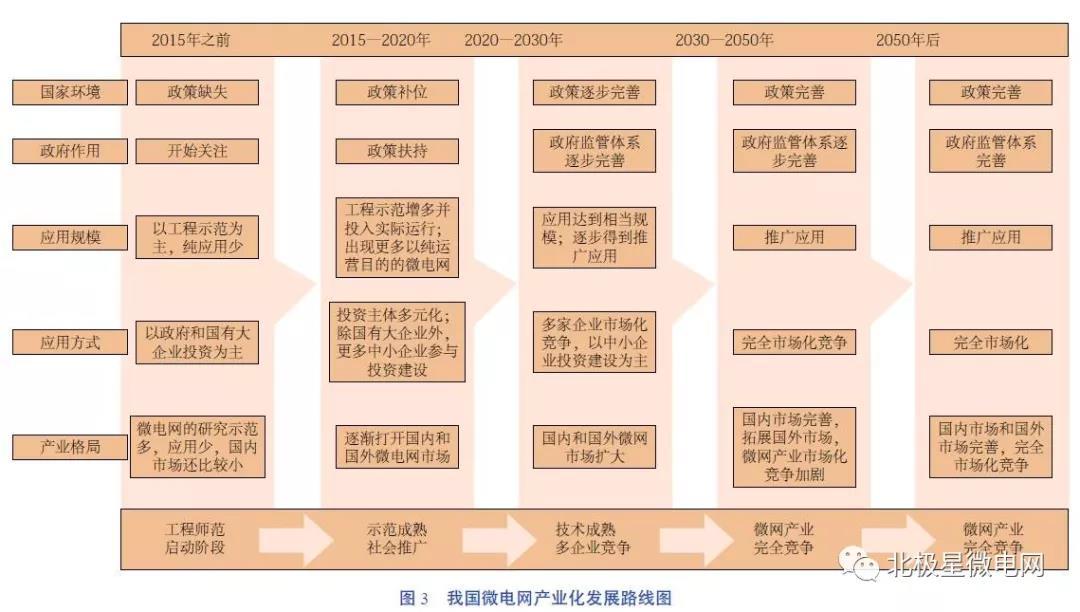 從樂觀角度看,未來 20 年將是微網(wǎng)產(chǎn)業(yè)政策完善階段,也是市場化蓬勃發(fā)展的階段。微網(wǎng)發(fā)展大幅向企業(yè)及獨立經(jīng)營型轉(zhuǎn)變的階段,且不需要政府補貼,市場相對開放,競價策略將會大幅推廣。對微網(wǎng)產(chǎn)業(yè)化發(fā)展路線詳細預(yù)測如圖 3 和圖 4 所示。