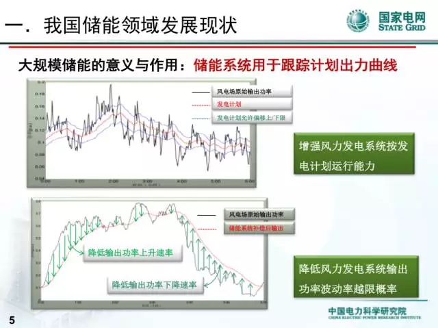 有兩項作用:第一是整個風光儲聯(lián)跟蹤和跟蹤出力的典型作用,要跟蹤那條線。第二個是平抑可再生能源發(fā)電速度的波動,通過幾年的示范下來以后,我們當時設計的幾大作用是可以滿足的,并且,這邊有一個知識點和大家分享一下,我們863項目里得出兩個重要的指標:一個是跟蹤計劃出力的精度,精度是做到了正負5%,就是整個聯(lián)合出力要跟蹤那條線是正負5%,平抑可再生能源波動有兩個指標,一個是每分鐘的波動率2%,每10分鐘的波動率是7%,這三個值作為硬性的要求,所有風電場或者光伏電站都能達到這些指標以后,對電網的接入是很友好的,因為技術的進步,證明了通過儲能和風電光伏配合,這些值都是能達到的,這是我們863定的指標,證明實際當中也是能實現(xiàn)的,假如可以實現(xiàn)這些指標,就可以大幅度的提升風電光伏的接納能力。