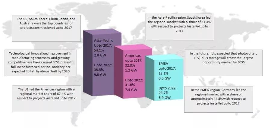 依據(jù)該報告,有以下幾個因素推動了全球電池儲能系統(tǒng)市場的發(fā)展:首先可再生能源份額逐步攀升,電池儲能系統(tǒng)技術(shù)應(yīng)用成為必需。其次,電信和數(shù)據(jù)中心等具市場商機的領(lǐng)域,對改進性能和行之有效的解決方案具有強烈需求,因此對電池儲能需求越來越大。第三,除光伏發(fā)電以外,儲能有助于節(jié)省公共事業(yè)消費。第四,頻繁的電力削減也急需采用此項技術(shù)。最后,電池價格逐年下降,這也推動了此項技術(shù)在全球范圍的發(fā)展,這也是該行業(yè)迅速增長的主要原因。