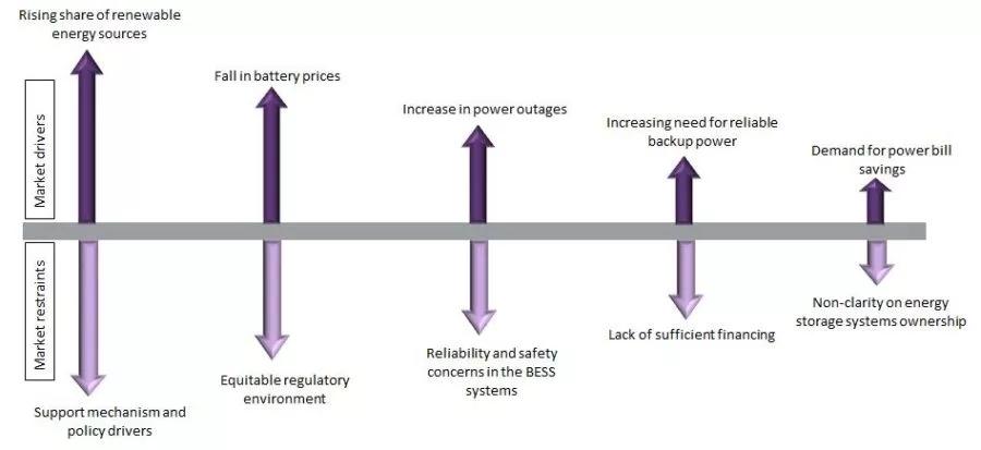 另一方面,電池儲能系統(tǒng)市場正面臨幾項挑戰(zhàn)。例如,合理監(jiān)管環(huán)境的缺失延緩了電池儲能系統(tǒng)項目的發(fā)展。電池儲能系統(tǒng)市場決定于于體制監(jiān)管障礙減少以及公私部門合作的鼓勵政策。目前沒有儲能設(shè)備通用的標準文件,因此每個制造商都可以自由開發(fā)各自的內(nèi)部標準,這導(dǎo)致系統(tǒng)在安裝和維護過程中存在兼容性問題。使用這種在不同公司技術(shù)和制造水平生產(chǎn)的唯一或者定制的備用件,會造成延緩整個工業(yè)經(jīng)濟規(guī)模的影響。應(yīng)制定可促進儲能技術(shù)的國家標準,以加強儲能滲透。這也有利于國家電力提高穩(wěn)定性和可靠性的解決方案。同時,電池儲能系統(tǒng)的可靠性和安全性問題、缺乏足夠資金、支持機制和政策驅(qū)動的缺失、以及儲能系統(tǒng)所有權(quán)的不明晰,都將是未來一段時間內(nèi)阻礙電池儲能系統(tǒng)快速增長的一些因素。