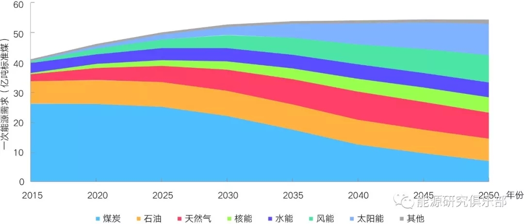 一是能源需求增速放緩,總量將較快進入平臺期。中國終端能源需求即將進入增長飽和階段,2035~2040年前后達到峰值后緩慢下降。一次能源需求2020~2025年進入增長飽和階段,約在2030年后進入平臺期,總量穩(wěn)定在56~58億噸標(biāo)準(zhǔn)煤,其中化石能源需求在2025年前后達到峰值41~43億噸標(biāo)準(zhǔn)煤。如果按照電熱當(dāng)量法計算可再生能源發(fā)電量,則一次能源需求將在2030~2035年達到峰值,峰值降至47~50億噸標(biāo)準(zhǔn)煤,如圖1。