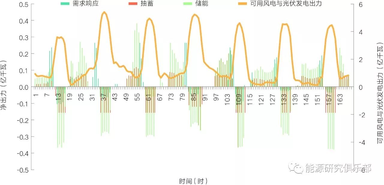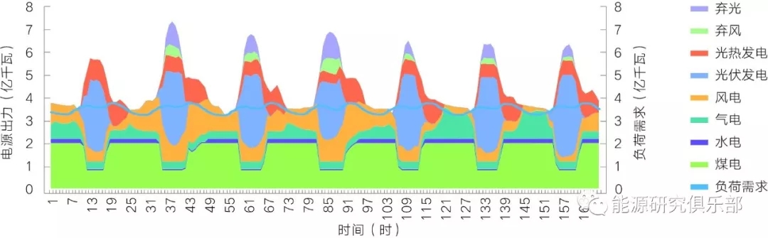 圖11 電氣化加速情景下2050年西北地區(qū)冬季典型周各類電源出力優(yōu)化結(jié)果