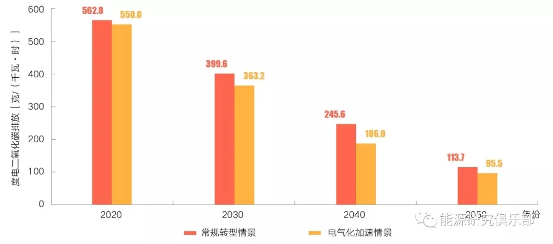 九是電力行業(yè)碳排放強度將大幅降低。隨著清潔能源發(fā)電量占比逐漸提升,電力行業(yè)碳排放總量在2025年前后出現(xiàn)峰值,峰值水平約為42億噸。2050年排放量降至14億噸,占全國碳排放的比重降至30%以下。單位電量碳排放強度方面,常規(guī)轉(zhuǎn)型情景與電氣化加速情景下2030年分別降至400克/千瓦時、363克/千瓦時左右,2050年分別降至114克/千瓦時、96克/千瓦時左右,低于當(dāng)前水平的五分之一,如圖14。
