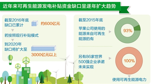 “綠證交易今后會是一個趨勢,因?yàn)榭稍偕茉囱a(bǔ)貼愈發(fā)捉襟見肘。”易躍春介紹說,目前我國可再生能源發(fā)電補(bǔ)貼資金來源單一,均來自電價附加征收。近年來補(bǔ)貼資金缺口呈逐年擴(kuò)大趨勢。截至2016年底,缺口已累計(jì)約600億元;若按照現(xiàn)行補(bǔ)貼模式,到2020年缺口將擴(kuò)大至3000億元以上。目前國家在努力降低實(shí)體經(jīng)濟(jì)成本,大幅提高電價附加標(biāo)準(zhǔn)并不現(xiàn)實(shí)。
