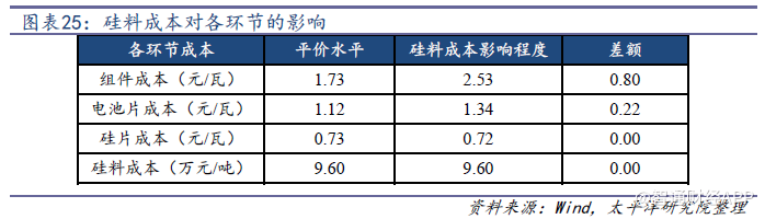 從企業(yè)利潤率來看,今年以來硅片、電池片降價明顯,目前硅料的價格也從年初的14萬元/噸降到11.9萬元/噸,但是據(jù)了解,硅料企業(yè)目前依然可以維持較高的利潤率,比如國內先進的硅料企業(yè)目前的全成本在6萬元/噸,即使按照平價上網(wǎng)的所要求貢獻的價格9.6萬元/噸,依然可以保持近50%的毛利率,因此我們認為硅料的平價成本壓力是最小的。