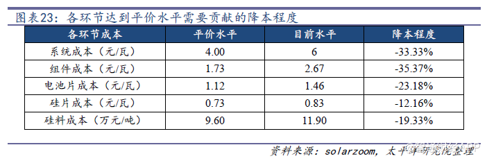 我們取4元/瓦的系統(tǒng)成本進行測算,得出當平價上網(wǎng)要求系統(tǒng)成本降到4元/瓦時,組件、電池片、硅片的成本分別需降到1.73、1.12、0.73元/瓦,而硅料成本需要降到9.6萬元/噸。未來組件、電池片、硅片和硅料環(huán)節(jié)需要貢獻的降本程度分為-35.37%、-23.18%、-12.16%及-19.33%。