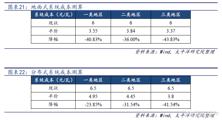 說明相對于地面式來說,分布式目前的系統(tǒng)成本水平更接近平價上網(wǎng)的標準。由于地面式電站大多建在一類二類地區(qū),而分布式電站大多建在二類三類地區(qū),所以我們得出滿足平價上網(wǎng)的系統(tǒng)成本區(qū)間在3.55-4.45元/瓦左右。