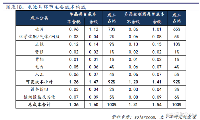 在組件環(huán)節(jié),主要的原材料成本包括電池片、玻璃、背板、EVA、鋁邊框、焊帶、接線盒、硅膠等,其他成本主要有人工成本和折舊成本。其中電池片成本占總成本比例為65%左右,是組件成本的最重要的組成部分。組件的降本途徑主要是通過提升單位面積內的功率來實現(xiàn),比如現(xiàn)在比較普及的半片組件、疊片組件和雙面組件等。