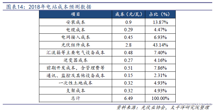 根據(jù)光伏業(yè)協(xié)會給出的2018年電站投資成本構成預測數(shù)據(jù)顯示,成本占比最大的就是組件,約占整個成本的43.14%。我們也重點討論光伏制造環(huán)節(jié)的降本途徑及成本測算。