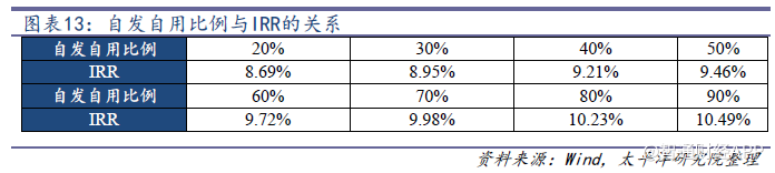 另外,我們以戶用分布式三類地區(qū)為例,測算不同自發(fā)自用比例對IRR的影響發(fā)現(xiàn),自發(fā)自用比例越高,電站的IRR也越高,兩者呈正向相關關系。