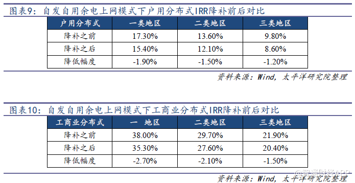通過測算,我們發(fā)現(xiàn)當執(zhí)行2018年的0.37元/瓦補貼標準之后,分布式電站的內部收益率不僅可以維持較高的水平,而且相較于地面式全額上網(wǎng)電站,其降低幅度更小,只有1.2%-2.7%左右,這也說明分布式電站相對于地面式電站來說更具有高收益性和吸引力。