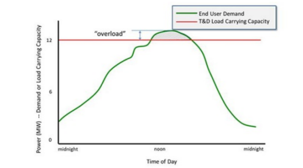 以這種方式考慮,為輸電系統(tǒng)增加更多容量通常需要全面更換電纜和變壓器,以便為輸電系統(tǒng)或配電系統(tǒng)(T&D)上的節(jié)點(diǎn)提供更多電源。采用儲(chǔ)能系統(tǒng)能夠削減該系統(tǒng)的高峰需求,如下圖所示為“過(guò)載”,從而允許繼續(xù)使用現(xiàn)有的輸電和配電系統(tǒng)。