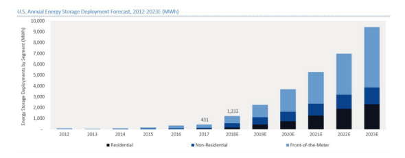儲(chǔ)能系統(tǒng)作為一種緩沖,能夠吸收和抵消不斷變化的能源供應(yīng)和需求。根據(jù)調(diào)研機(jī)構(gòu)GTM公司的統(tǒng)計(jì),2017年美國(guó)安裝部署了431兆瓦時(shí)的儲(chǔ)能系統(tǒng),預(yù)計(jì)2018年將增長(zhǎng)三倍,達(dá)到1233兆瓦時(shí)。