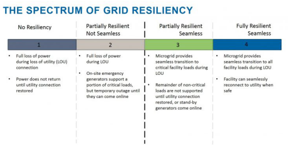 圖中所示的微電網(wǎng)彈性范圍從沒有彈性到完全具有彈性,并且可以實(shí)現(xiàn)從連接到電網(wǎng)的實(shí)際無縫過渡。沒有部署微電網(wǎng)的客戶(例如住宅用戶)在電網(wǎng)中斷期間將會完全中斷。一旦電力公司診斷并解決了電網(wǎng)中斷或故障,其電力才會恢復(fù)正常。