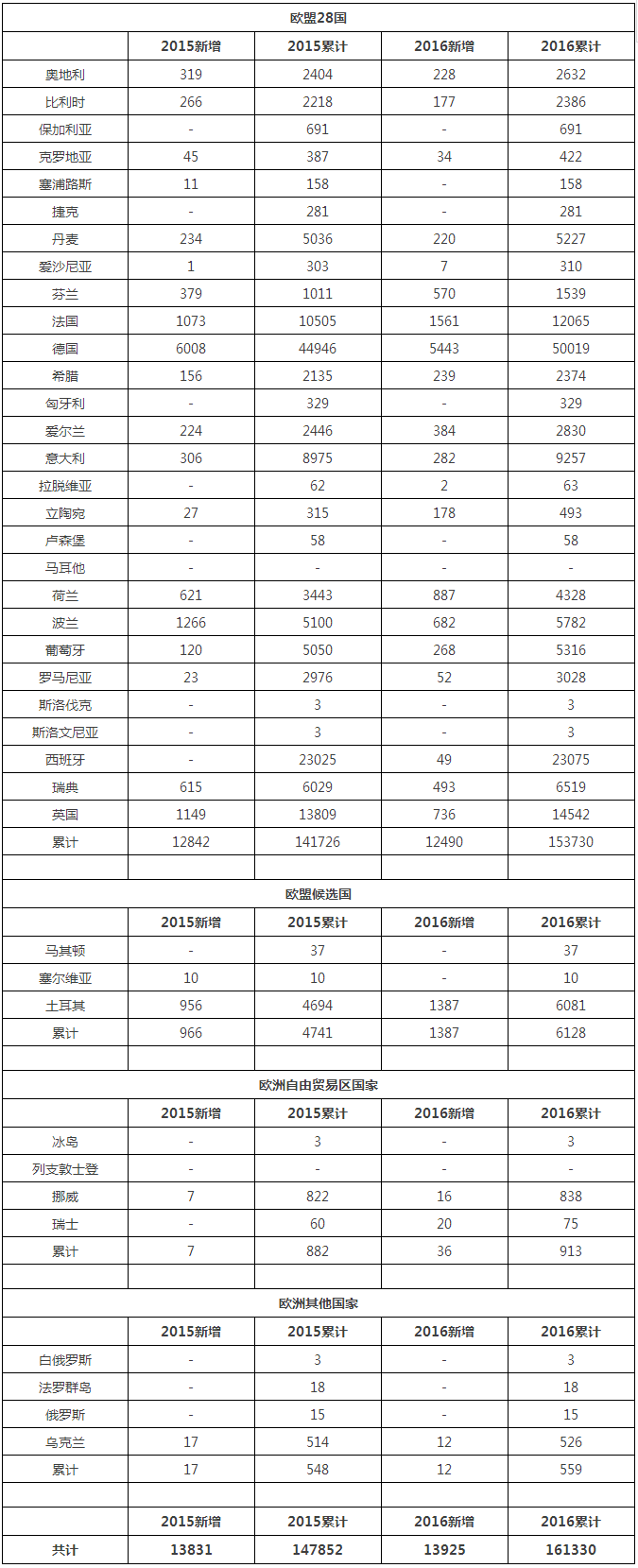 表1 2015-2016歐洲各國(guó)新增和累計(jì)裝機(jī)統(tǒng)計(jì)(MW)