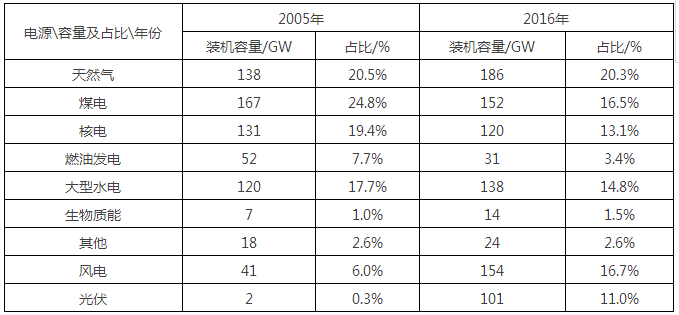 表2 2005年和2016年歐盟各電源占比統(tǒng)計(jì)(GW、%)