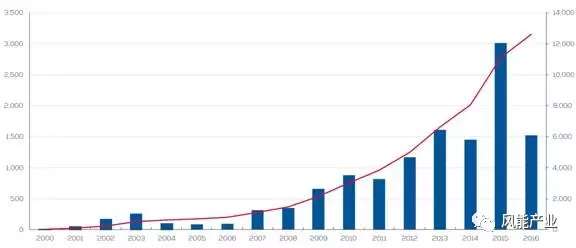 圖5 2000-2016年歐洲歷年新增、累計(jì)并網(wǎng)海上風(fēng)電機(jī)組容量(MW)