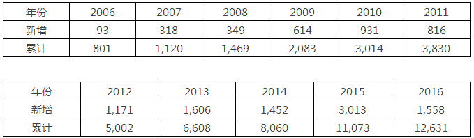 表3 2006-2016年歐洲新增和累計(jì)海上風(fēng)電機(jī)組容量統(tǒng)計(jì)(MW)
