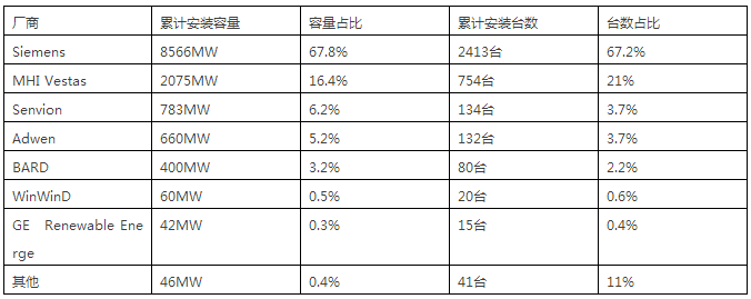 從歐洲累計(jì)安裝的海上風(fēng)電機(jī)組數(shù)量來(lái)看,Siemens占到了累計(jì)安裝數(shù)量的67.2%,接下來(lái)是MHI Vestas的21%、Senvion的3.7%、Adwen 的3.7%和BARD的2.2%。