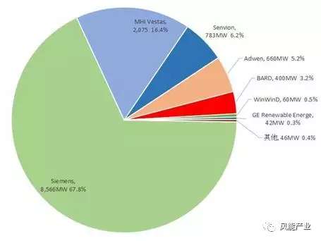 從歐洲累計(jì)安裝的海上風(fēng)電機(jī)組容量來(lái)看,Siemens占到了累計(jì)安裝容量的67.8%,接下來(lái)是MHI Vestas的16.4%、Senvion的6.2%、Adwen 的5.2%和BARD的3.2%。