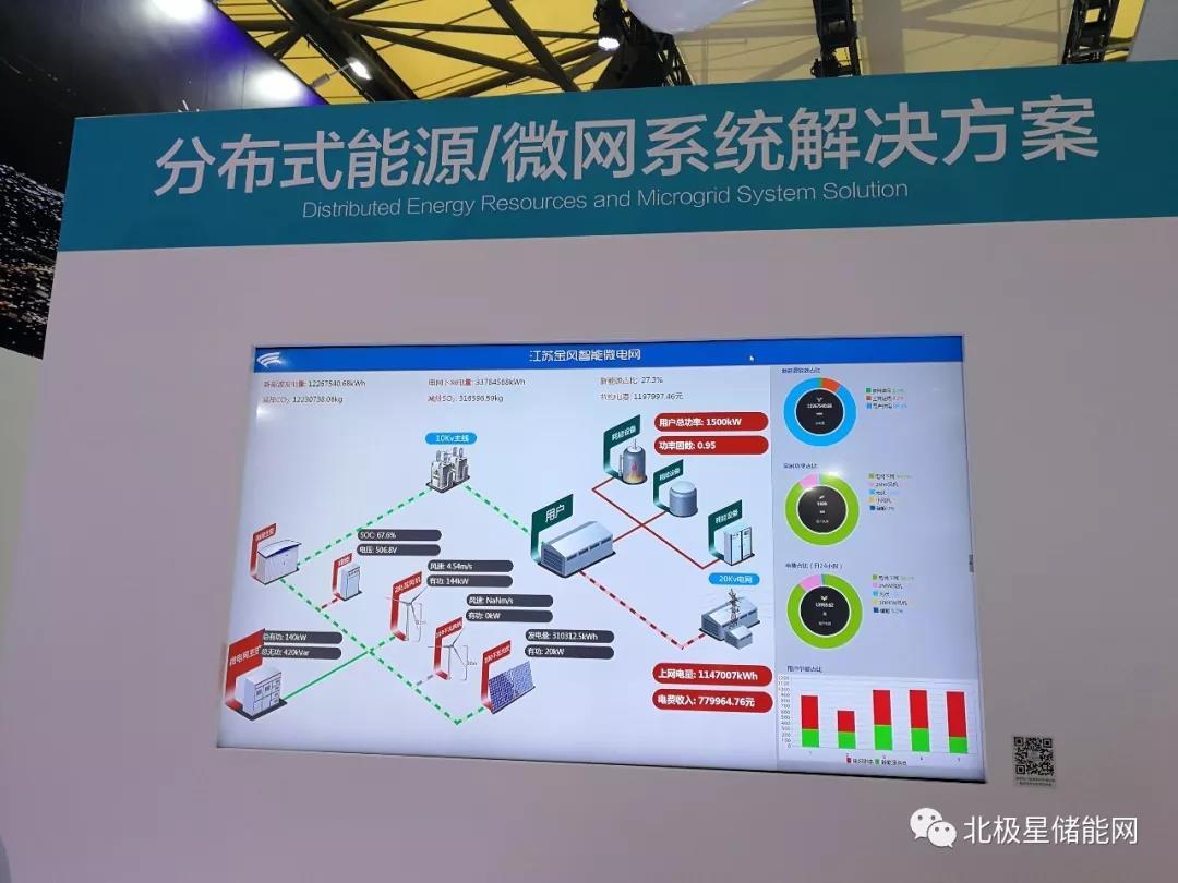 本次展會上展出的分布式能源/微網(wǎng)系統(tǒng)解決方案以江蘇金風智能微電網(wǎng)為例,顯示上網(wǎng)電量為1147007KWh,電費收入779964.76元,解決方案應用形式包括分布式光伏解決方案、分散式風電解決方案、智能微網(wǎng)解決方案、儲能系統(tǒng)解決方案、燃氣三聯(lián)供解決方案。