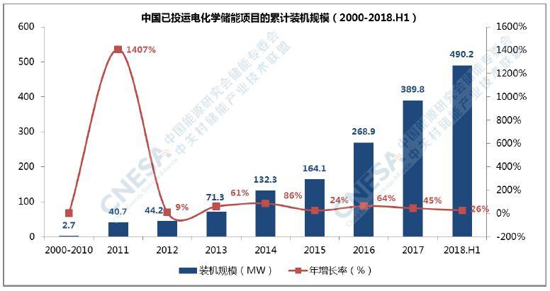 截至2018年6月底,中國已投運(yùn)電化學(xué)儲能項目的累計裝機(jī)規(guī)模為490.2MW,占比為1.6%,相比2017年底上升0.3個百分點(diǎn)。
