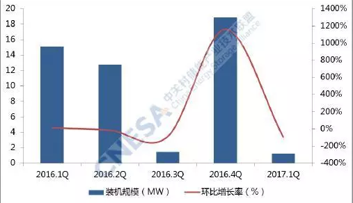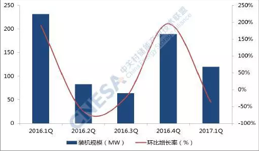 圖4連續(xù)五個(gè)季度新增投運(yùn)項(xiàng)目的裝機(jī)分布及環(huán)比增長率(中國)